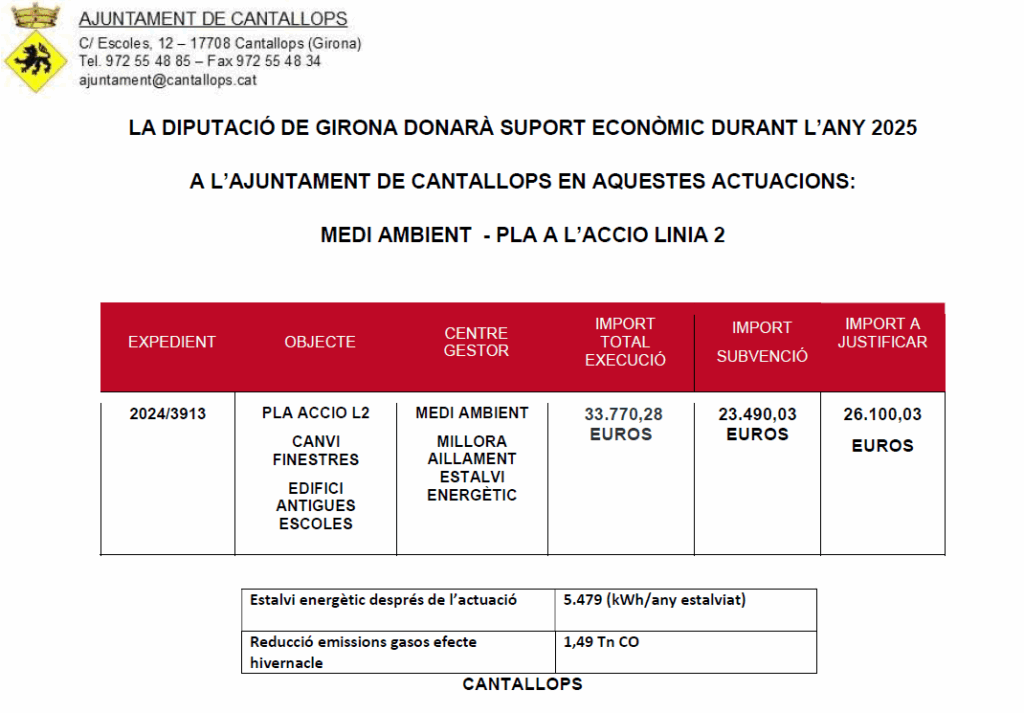 La Diputació de Girona donarà suport econòmic durant l’any 2025 a l’Ajuntament de Cantallops en aquestes actuacions: Medi ambient – Pla a l’Acció Línia 2